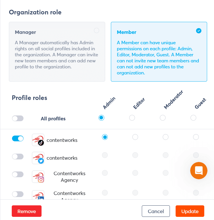عند إضافة ملف تعريف وسائط اجتماعية جديد إلى لوحة معلومات Agorapulse ، لا تنس إضافة أعضاء فريقك! يمكن أن تتضمن كل قناة وسائط اجتماعية أعضاء الفريق الذين تريدهم ويمكنك أيضًا ضبط أذوناتهم. هذه ميزة رائعة للشركات التي لديها مدير وسائط اجتماعية ومدير مجتمع. سيقوم أحدهما بتحميل وإدارة إنشاء المحتوى ، والآخر سيتعامل مع التعليقات. بالنسبة إلى وكالة تسويق مثل وكالتنا ، فإننا نضع أعضاء الفريق الذين يتعاملون مباشرة مع الحساب كمسؤولين فقط. يمكن لدور المسؤول نشر المحتوى وإجراء عمليات بحث الاستماع وإنتاج التقارير.