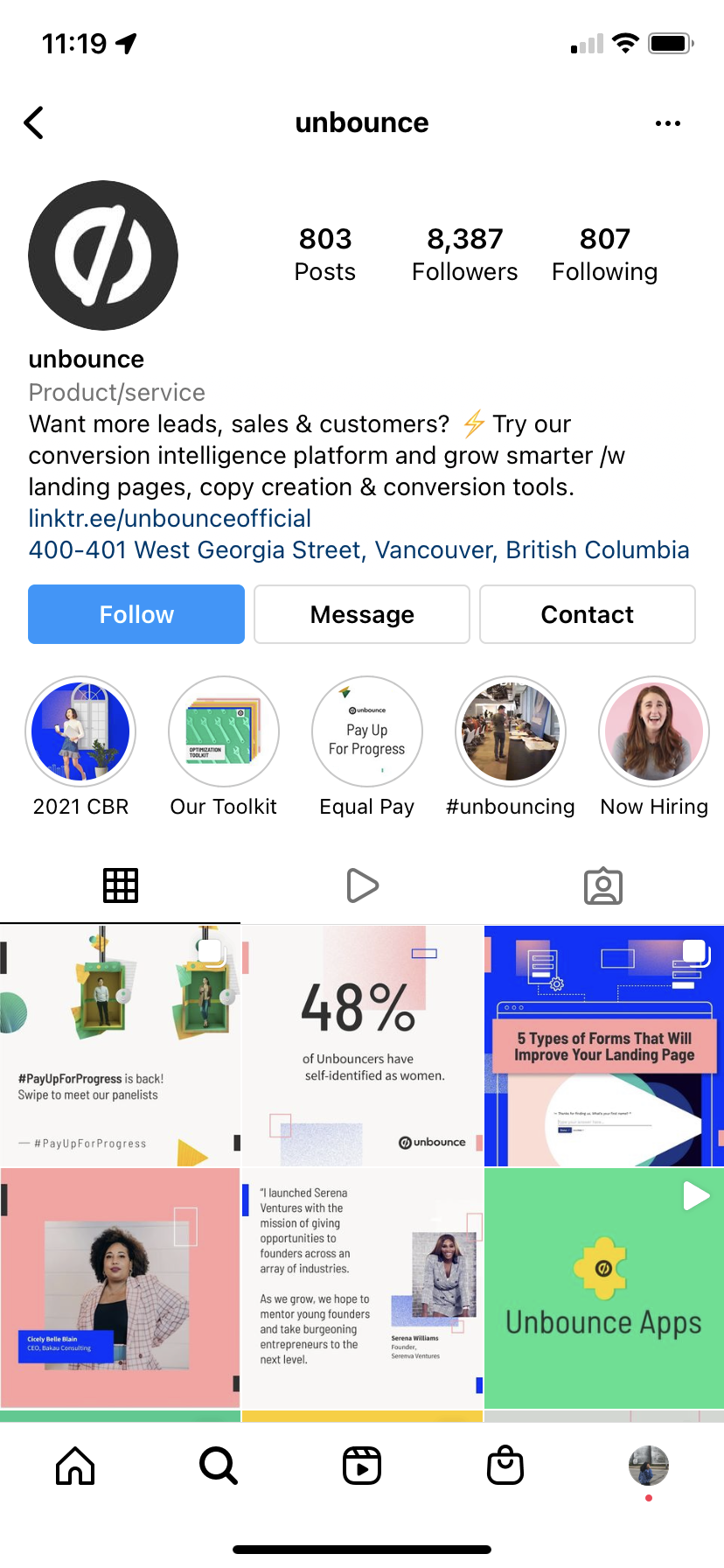 إذا كان أي شخص يعرف أي شيء عن التحويلات ، فهو فريق Unbounce. عندما يتعلق الأمر بتحويلات حركة المرور على Instagram ، يعتمد مزود حلول الصفحة المقصودة على Instagram Stories Highlights.
