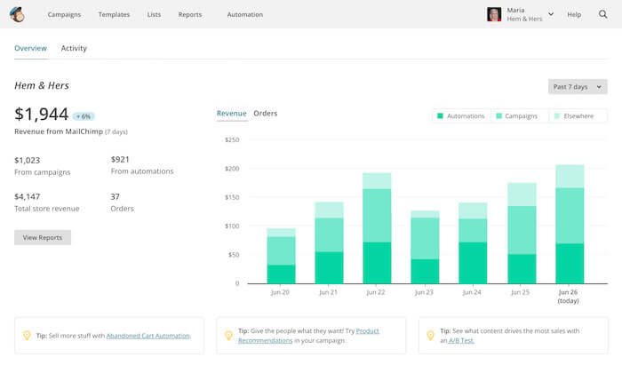 تقدم Mailchimp كل ما سبق ، بالإضافة إلى التتبع الجغرافي وتقارير الوسائط الاجتماعية وخرائط النقرات ، بالإضافة إلى أشياء رائعة مثل نجاح الرسائل الإخبارية لكل مزود (Gmail مقابل Yahoo على سبيل المثال). والأكثر إثارة للإعجاب ، أنها توفر ميزة فريدة لتتبع تحويل التجارة الإلكترونية تتيح لك معرفة متى يتم بيع المنتجات من خلال متجرك ، وكيف.