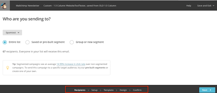 إحدى الميزات التي نحبها حقًا هي قائمة التنقل عند إنشاء حملة في Mailchimp. يمكنك المضي قدمًا والخلف للتحقق من كل خطوة في الحملة وللتأكد من أن كل شيء في مكانه الصحيح.