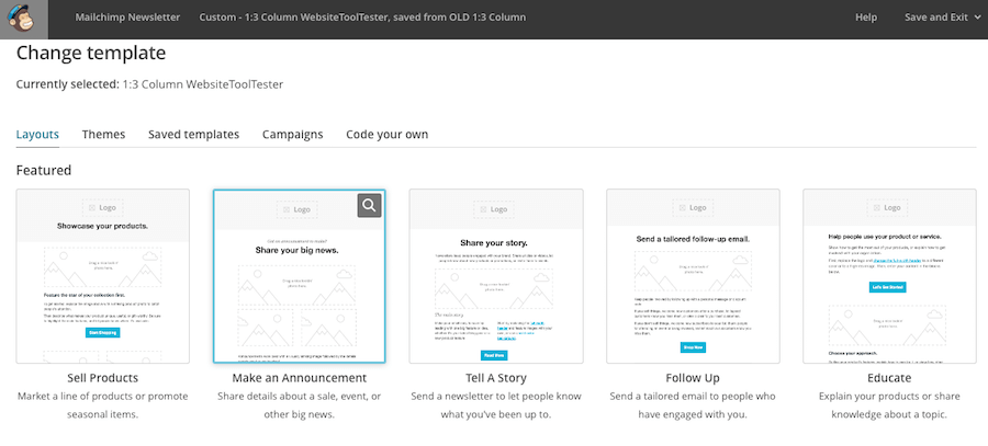 لسد الفجوة بين التعليمات البرمجية المخصصة والقالب ، يقدم Mailchimp بعض القوالب الفارغة التي تسمى التخطيطات. هذه هي في الأساس بنية فارغة حيث يمكنك إضافة المحتوى الخاص بك مثل الصور والنص. إنه سهل الاستخدام ، وعلى الرغم من أن Constant Contact يقدم 3 أو 4 منهم أيضًا ، إلا أنها ليست مفيدة في أي مكان.