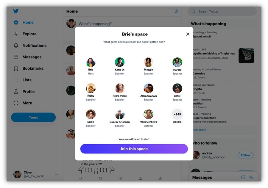 طريقة أخرى لتسلل الصوت إلى عالم التسويق هي من خلال وسائل التواصل الاجتماعي. تقدم العديد من المنصات الآن طرقًا لتعزيز المجتمعات من خلال غرف الدردشة الافتراضية مع المتحدثين والمستمعين المعينين. على سبيل المثال ، قدم Twitter مساحات Twitter بالإضافة إلى التغريدات الصوتية. باستخدام Twitter Spaces ، يمكن للأشخاص الاستماع والدردشة مع الآخرين حول الموضوعات الساخنة. التغريدات الصوتية هي مقاطع صوتية يمكن للمتابعين تشغيلها.