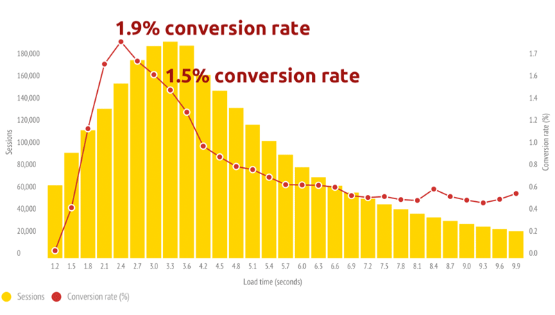على الجانب المحمول ، يتم تنزيل صورة تزن 1 ميغا بايت في حوالي 0.3 ثانية. فكر فقط في الوقت الذي ترغب عادةً في الانتظار لفتح صفحة ويب: وفقًا لـ Kinsta ، يتخلى 74٪ من المستخدمين عن الصفحات التي لا يتم تحميلها في غضون 5 ثوانٍ ، بينما تُظهر البيانات الواردة أدناه بواسطة Soasta كيف يبدأ معدل التحويل السقوط قبل ثانيتين.