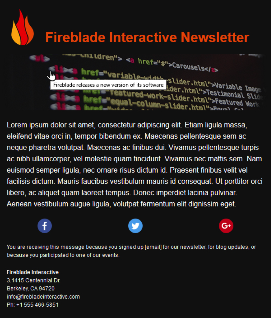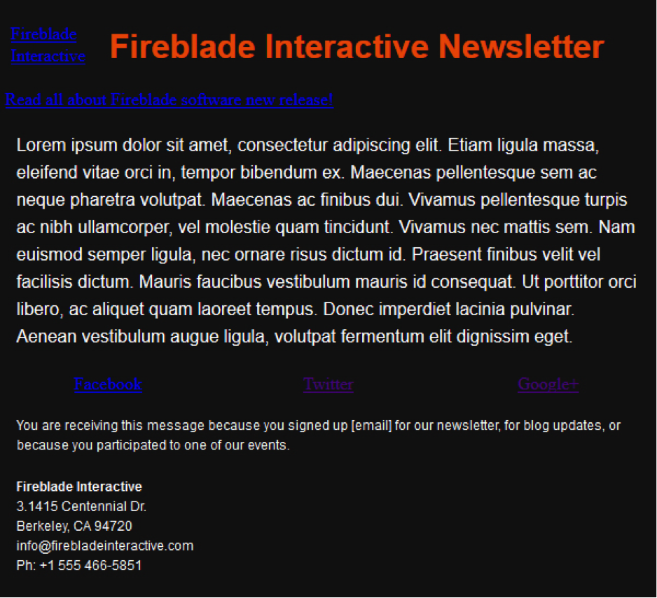 توضح لك لقطة الشاشة أدناه كيفية عرض النشرة الإخبارية لعميل بريد إلكتروني يستبعد تحميل الصور . يمكنك مشاهدة الروابط الكلاسيكية الزرقاء والبنفسجية التي تظهر على التوالي وجود رابط ورابط تمت زيارته مسبقًا.