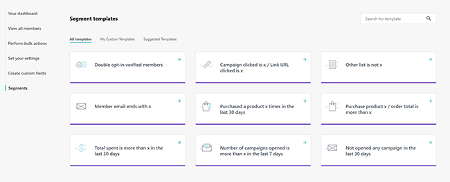 على سبيل المثال، هناك قوالب شرائح للأعضاء الذين تم التحقق منهم، وقوالب لإنشاء شرائح بناءً على سجل الشراء الخاص بجهة الاتصال، وقوالب لإنشاء شرائح بناءً على طول الفترة الزمنية منذ آخر مرة فتحت فيها جهة الاتصال البريد الإلكتروني، وما إلى ذلك.