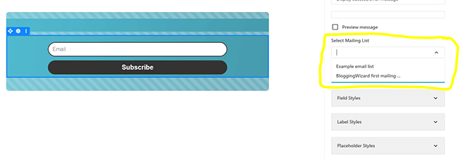 على سبيل المثال، إذا نقرت فوق مربع النموذج ، يمكنك تحديد القائمة البريدية التي تريد إضافة المشترك الجديد إليها عند إرسالها. ويمكنك تغيير رسالة العرض التي تظهر بعد ذلك أيضًا.