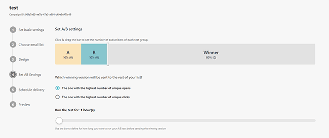 يمكنك أيضًا إخبار Moosend بالطريقة التي تريد بها تحديد المتغير "الفائز" (أي عن طريق عمليات الفتح الفريدة أو النقرات الفريدة)، والمدة التي تريد إجراء الاختبار خلالها.