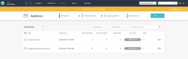 لإنشاء قائمتك الأولى، انقر فوق إنشاء قائمة بريد إلكتروني في قائمة التحقق من البدء السريع أو حدد الجمهور > قوائم البريد الإلكتروني من شريط التنقل العلوي. ثم قم بتسمية قائمتك الجديدة.
