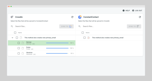 يتيح لك تطبيق Crowdin لترجمة محتوى Constant Contact مزامنة الملفات المصدر والمترجمة ببضع نقرات. كيف يعمل؟ لا يوجد تصدير / استيراد لمحتوى مصدر يدوي أو لصق نسخ نصية. ما عليك سوى النقر على "مزامنة إلى" واستمر في العمل.
