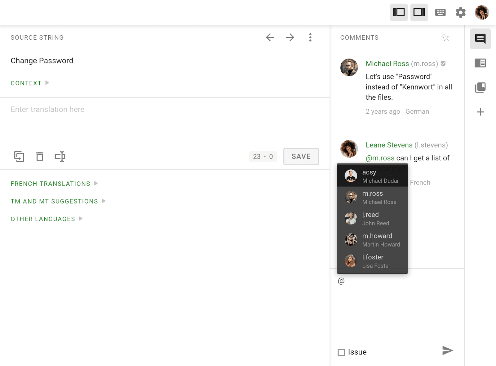 داخل المحرر ، يمكنهم كتابة التعليقات ومراجعة الترجمات وطرح الأسئلة والإشارة إلى الترجمات غير ذات الصلة وطلب المزيد من السياق.