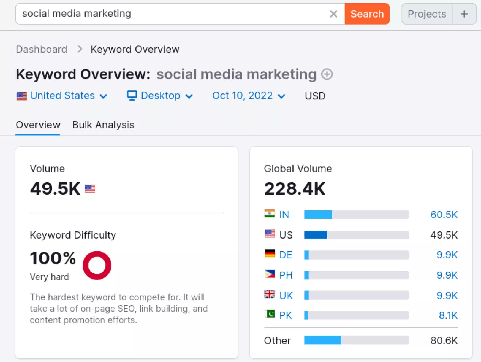 على سبيل المثال ، كنت تبحث عن كلمة رئيسية جيدة حول "التسويق عبر وسائل التواصل الاجتماعي" . المصطلح نفسه يحتوي على حجم بحث عالمي يقارب 230 ألفًا ، ومع ذلك ، فإن صعوبة الكلمات الرئيسية هي 100 ٪ ، وفقًا لـ Semrush.
