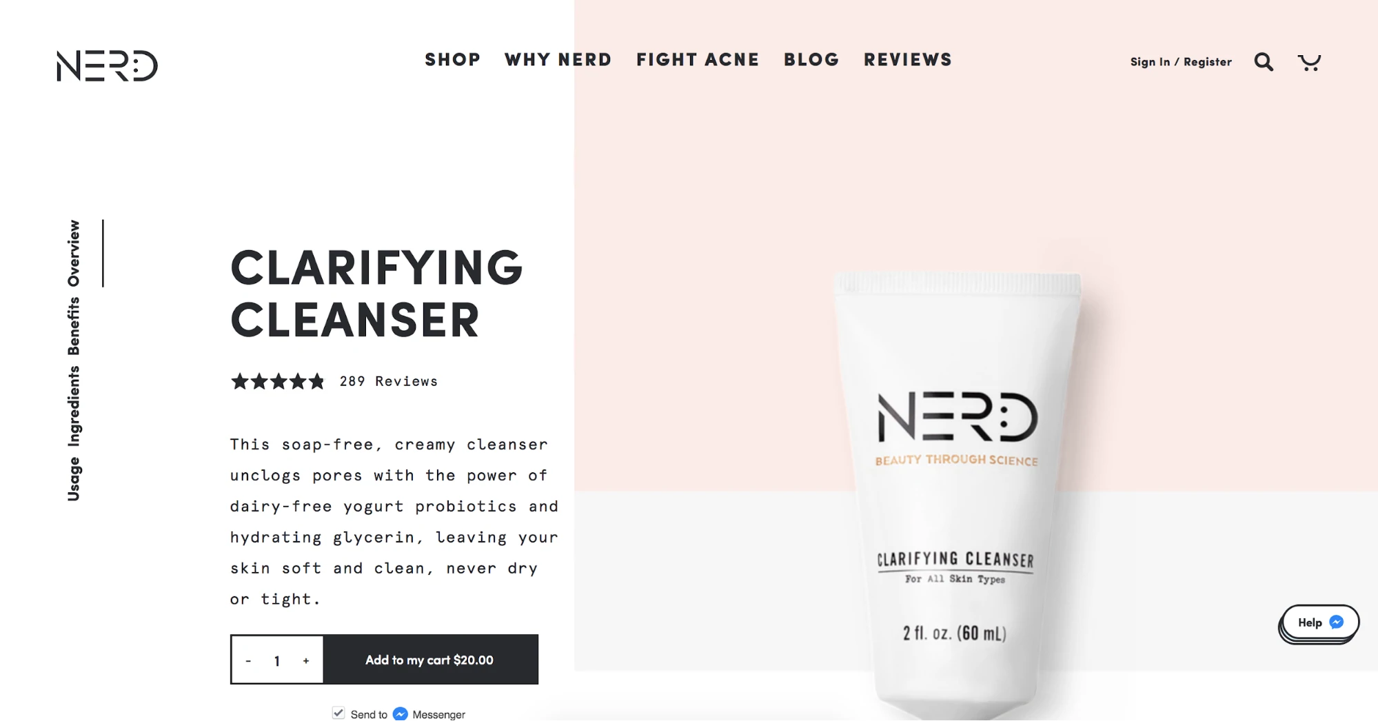 يطبق Nerd Skincare هذا المبدأ بذكاء من خلال تقديم ملخص مقطر للمنتج وما هو مصنوع منه والمزايا التي يمكن أن يوفرها في فقرة واحدة واضحة في أعلى الصفحة.