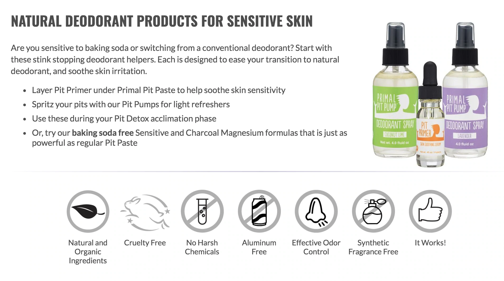 عندما لا تشير إلى منظمة رسمية أو معيار رسمي (مثل "USDA Organic") ، يمكنك إنشاء شاراتك الخاصة التي تقوم ببساطة بتقطير الميزات المهمة لمنتجك. على سبيل المثال ، ستعمل ميزات مثل "صنع في كندا" أو "جودة عالية" بشكل أفضل كشارات مصممة بشكل جيد مقارنة بالنقاط البسيطة في وصف المنتج. يستخدم Primal Pit Paste شارات بطريقة تلخص منتجاتها بصريًا.