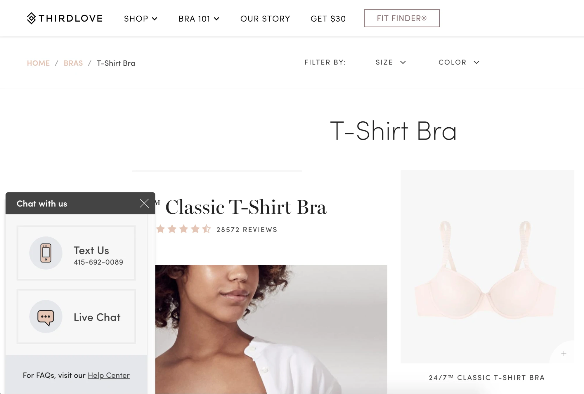 عندما يختار زوارك استخدام الدردشة المباشرة ، فهذه هي فرصتك لمساعدتهم على معالجة الأسئلة التي قد تعطل عملية الشراء. ليس عليك أن تكون مندوب مبيعات ؛ فقط كن مفيدًا وشفافًا قدر الإمكان. على سبيل المثال ، يتناسب توفر الدردشة المباشرة مع مهمة ThirdLove المعلنة لمساعدة عملائها في العثور على حمالة صدر تناسبهم.