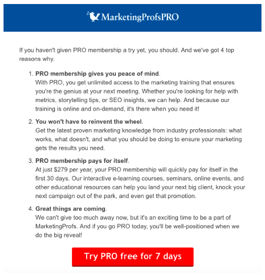 قم بتضمين مراسلات المتابعة كجزء من استراتيجية المبيعات الخاصة بك لوضع عرض مبيعاتك للنجاح من البداية. تعد المتابعة مهمة بشكل خاص للشركات التي تقدم خدمة مجانية وتحتاج إلى تشجيع المستخدمين على الترقية إلى خطة مدفوعة. فيما يلي مثال على بريد إلكتروني لمتابعة المبيعات من MarketingProfs يخدم هذا الغرض تمامًا: