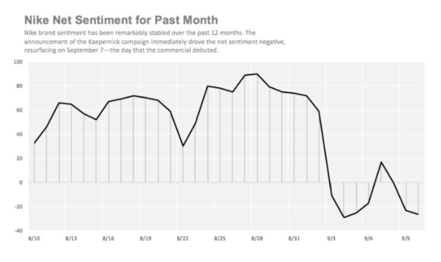 والأهم من ذلك ، يمكن أن يساعدك تحليل المشاعر في التدقيق في مجموعات البيانات القديمة أو غير المفيدة أو غير ذات الصلة للعثور على المعلومات الجديدة التي ستساعد في اتخاذ قرارات العمل وإثبات عائد استثمار جيد بالفعل. على سبيل المثال ، في عام 2018 ، أدارت شركة Nike حملة شارك فيها نجم أمريكي لم يكن الجمهور مغرمًا بها كثيرًا. ونتيجة لذلك ، انخفض صافي معنوياتهم خلال فترة 12 شهرًا.