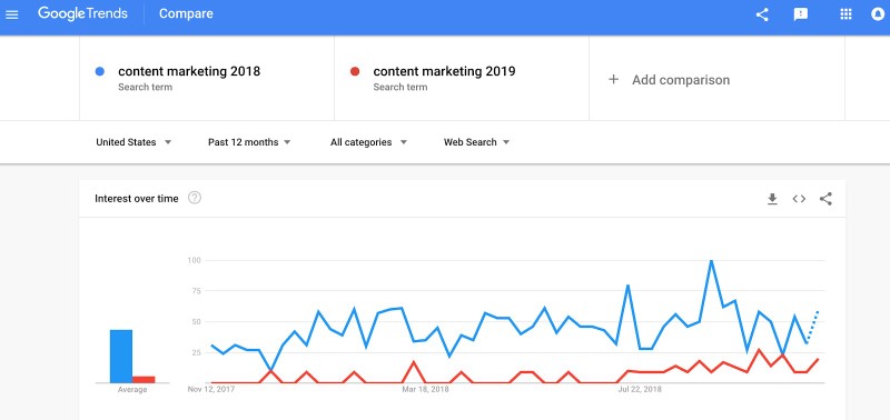 لتوضيح هذه الفكرة ، نقارن أدناه الاهتمام بمصطلحي "تسويق المحتوى 2018" و "تسويق المحتوى 2019". ومن الواضح أن الجميع يتحدث عن 2018 تسويق المحتوى في 2018، ولكن لم تكن هناك العديد من الصفحات المفهرسة التي تغطي منتصف 2019 استراتيجيات مدار السنة.
