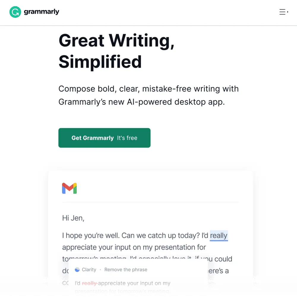 تضمن لك هذه الأداة خفيفة الوزن إنشاء محتوى خالٍ من الأخطاء بنسبة 100٪ لحملات تحسين محركات البحث (SEO) - بفضل اقتراحات التصحيح الآلي للكشف عن الأخطاء وتصحيحها. يمكنك أيضًا استخدام Grammarly للتحقق من السرقة الأدبية (عن قصد أو بغير قصد) لتجنب عقوبات Google بسبب المحتوى المكرر.