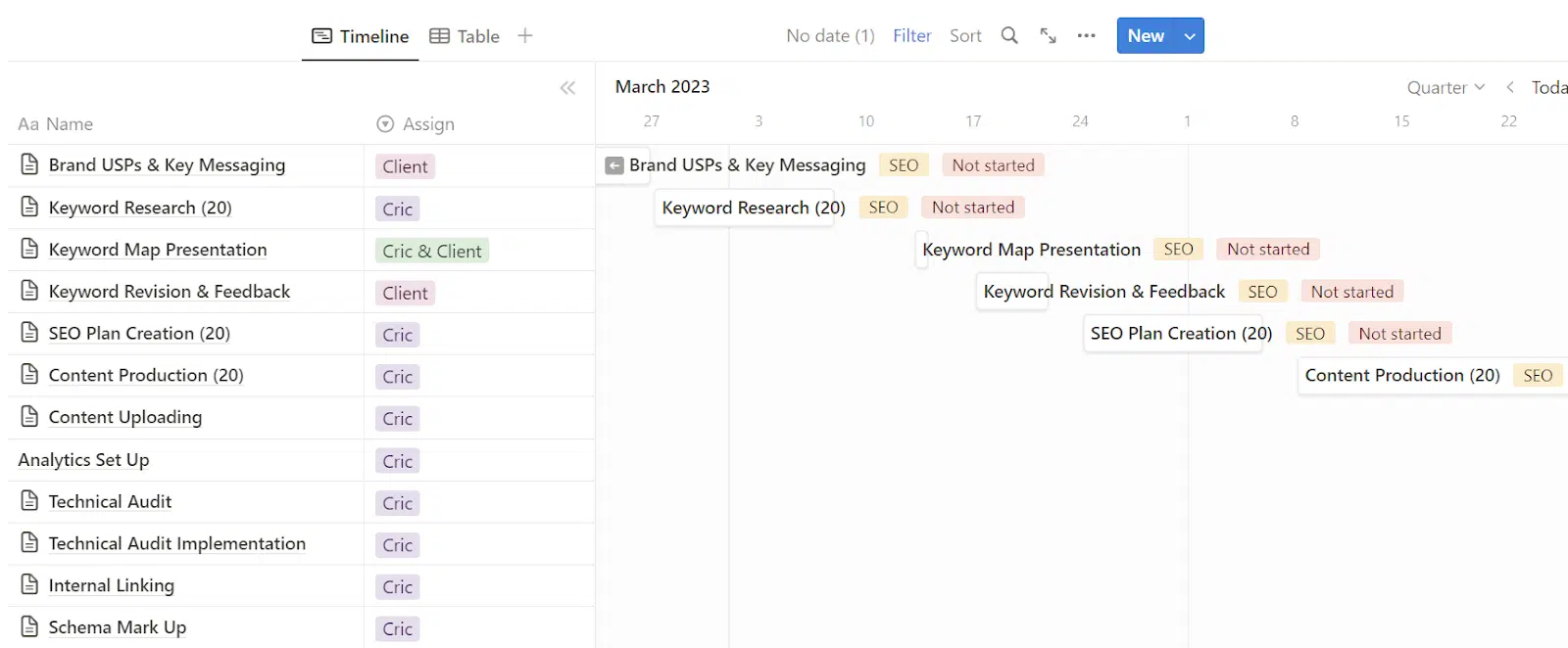 من خلال بضع نقرات فقط ، يمكنني ملء مخطط زمني كامل لخارطة طريق تحسين محركات البحث ، كل منها مقسم إلى تذاكر بنماذج محددة ليتم تفويضها لأعضاء الفريق ومشاركتها مع العملاء. وفيما يلي بعض الأمثلة على ذلك: