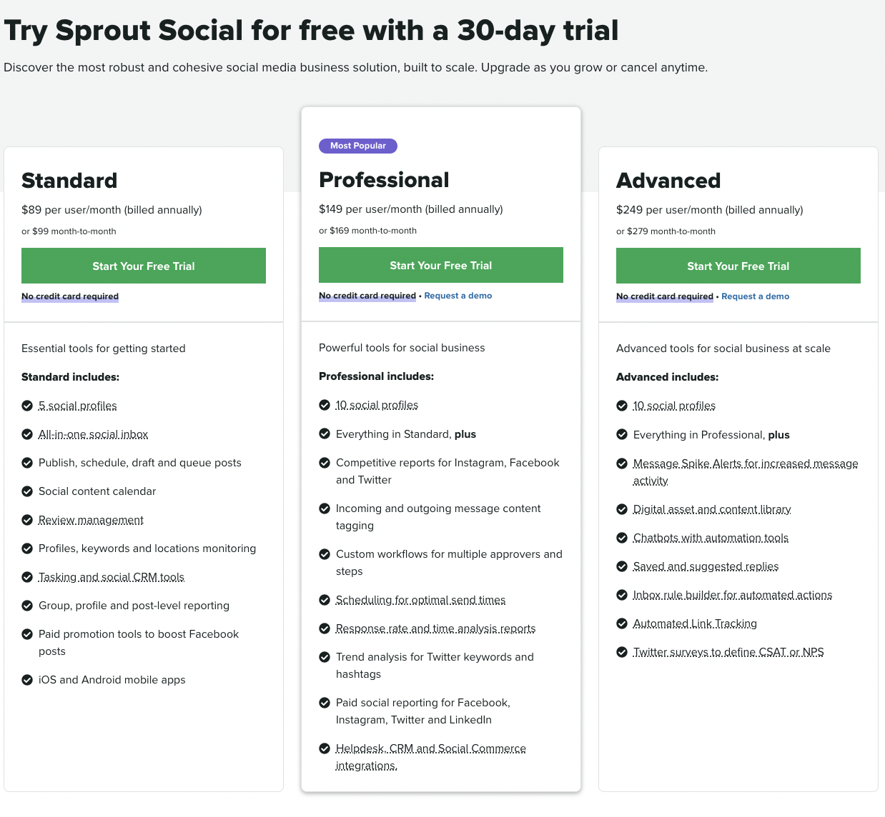 للحصول على نظام أساسي قوي ومتماسك لإدارة الوسائط الاجتماعية مثل Sprout Social ، يمكنك أن تتوقع أن تدفع حوالي 89 دولارًا إلى 1000 دولار شهريًا اعتمادًا على خطتك واحتياجات التكامل وحجم فريقك الاجتماعي.