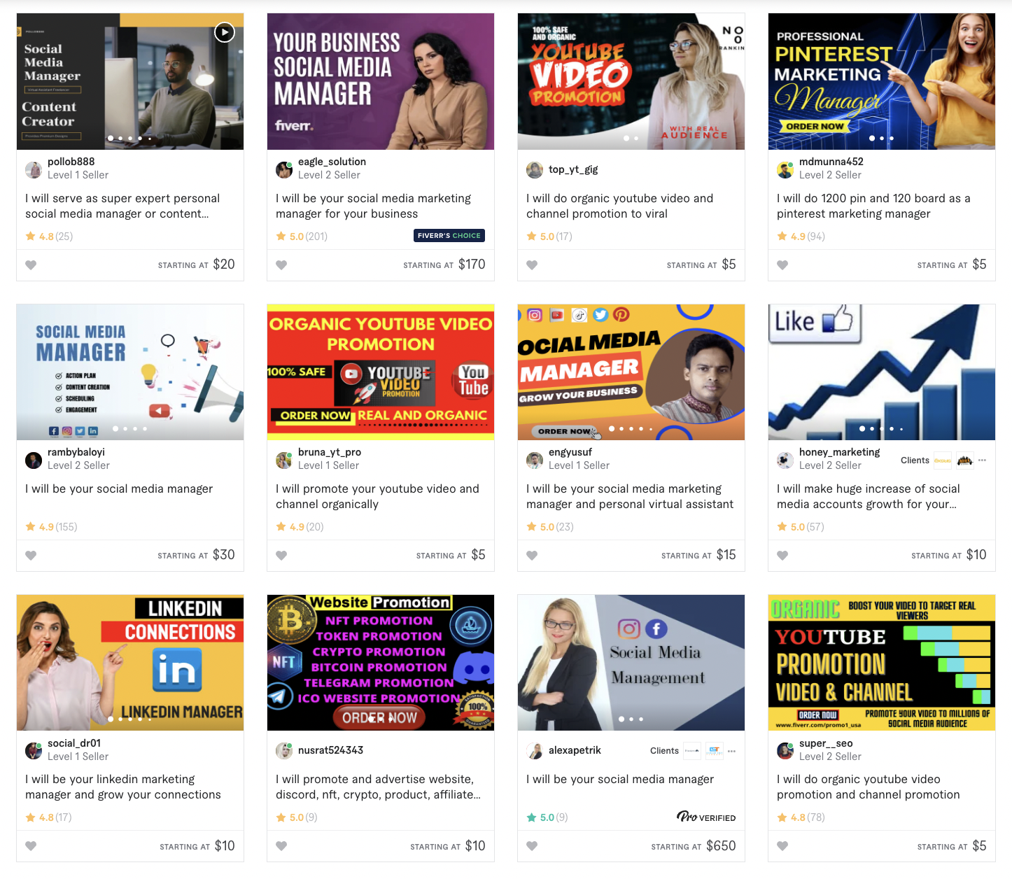- Fiverr: سوق عالمي على الإنترنت لخدمات المستقلين. يُعرف Fiverr بأنه خيار فعال من حيث التكلفة ، ويساعد العلامات التجارية على سد الفجوات في الإدارة الشاملة لوسائل التواصل الاجتماعي وتحقيق أهداف خاصة بالمنصة.