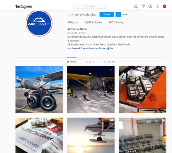Airframes Alaska ، منتج طيران ومصنع معدات خارجية يتمتع بميزة المناظر الطبيعية في ألاسكا لإضافة الاهتمام إلى صفحته على Instagram. إلى جانب الصور ومقاطع الفيديو الخاصة بمنتجاتها قيد التشغيل ، تأخذ الشركة أيضًا الأشخاص بانتظام إلى المصنع على Instagram. تربط هذه الصفحة العلامة التجارية بفعالية بالمغامرة الخارجية.