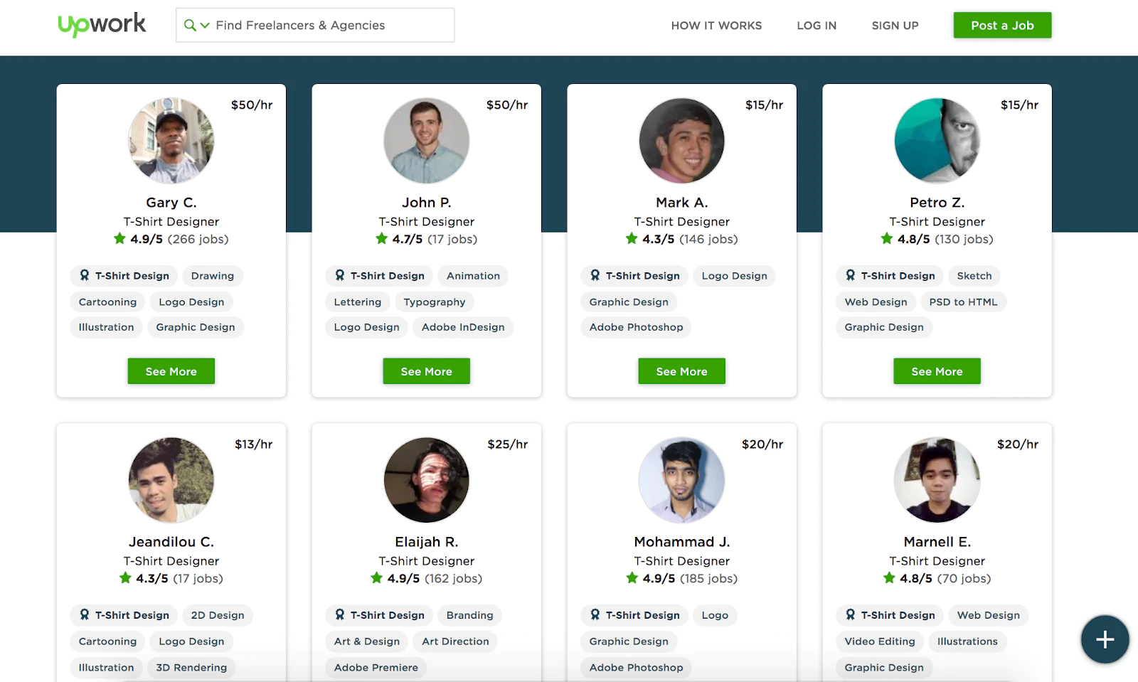 بعض الخيارات الأخرى التي قد ترغب في تجربتها هي شبكات العمل المستقل الشهيرة مثل Freelancer و Upwork. يمكنك العثور على مصممي قمصان مؤهلين وبسرعة والتحقق من نجاحاتهم الوظيفية السابقة ومحفظة أعمالهم. إذا كنت تحب شخصًا ما ، فيمكنك التواصل مباشرة في النظام الأساسي وتوظيفه على الفور.