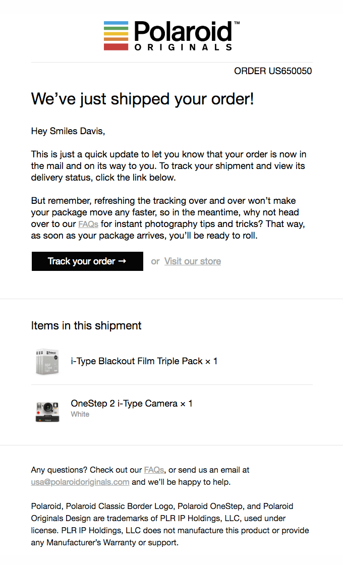 التالي في السلسلة هو البريد الإلكتروني لتأكيد الشحنة. يحتوي على معلومات قياسية ، لكن الفقرة الثانية هي المفضلة لدي. يقول Polaroid أن "تحديث التتبع مرارًا وتكرارًا لن يجعل الحزمة الخاصة بك تتحرك بشكل أسرع ، لذلك في هذه الأثناء ، لماذا لا تتوجه إلى الأسئلة الشائعة للحصول على نصائح وحيل التصوير الفوري؟"