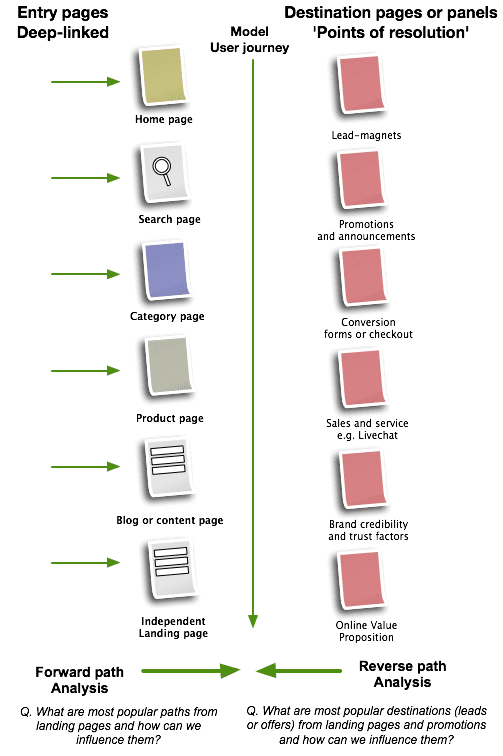 يقترح مرئياتنا مدى تعقيد التحليل والاختبار الذي نحتاج إلى تحقيقه لتحسين الرحلات والتحويل نظرًا لوجود العديد من نقاط الدخول المختلفة إلى الموقع وأنواع مختلفة من الصفحات واللوحات داخل الصفحات تحتاج إلى إقناع الجماهير.