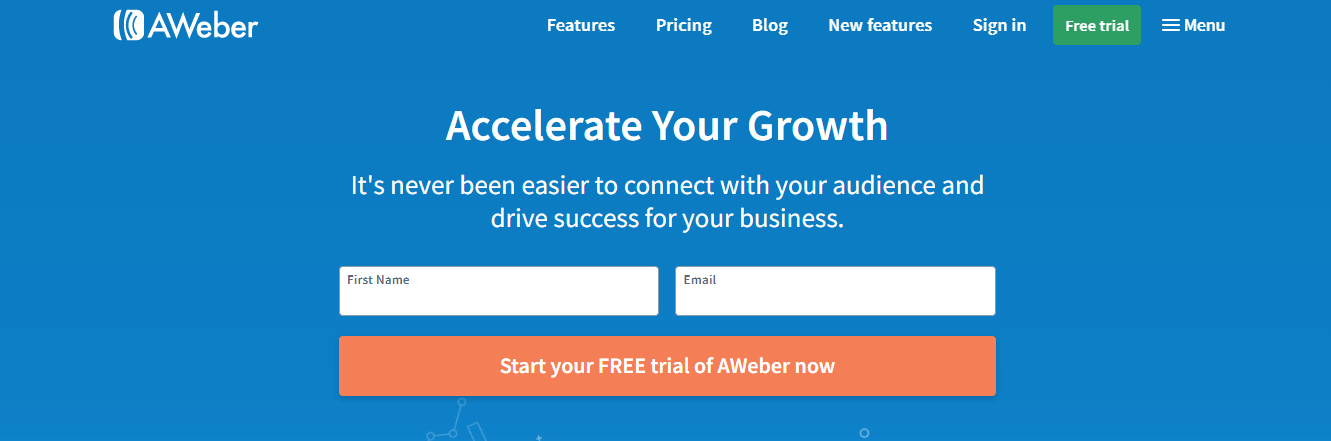 5. Aweber: موقع آخر شهير يمكن لمسوقي التجارة الإلكترونية الاستفادة منه وهو AWeber . تتضمن الخيارات الوظيفية على موقع الويب أدوات موثوقة يمكنك من خلالها رعاية العملاء المحتملين وإرسال رسائل بريد إلكتروني تسويقية إليهم بانتظام. كما أنها توفر لوحة معلومات تمنحك تحليلاً مفصلاً للحملة جنبًا إلى جنب مع رؤى قابلة للاشتقاق لتحسين الإستراتيجية.