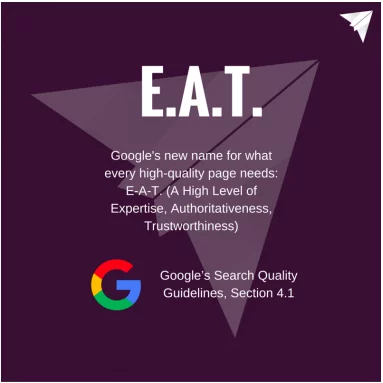 يمثل EAT الخبرة والسلطة والجدارة بالثقة. هذه ثلاثة عوامل أساسية تأخذها Google في الاعتبار عند تحديد رتبة موقعك. لذلك ، من خلال العمل على تحسين طعامك ، ستعمل في النهاية على تحسين مُحسّنات محرّكات البحث لديك وتعزيز رتبتك.