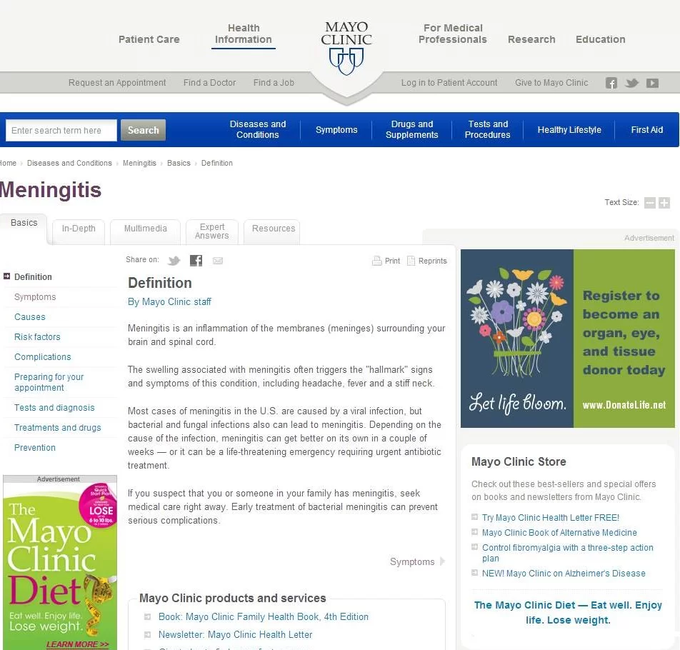 محتوى طبي عالي الجودة: مقال عن التهاب السحايا من موقع Mayo Clinic على الويب. وفقًا لـ QRG ، يظهر المحتوى على موقع ويب موثوق به وموثوق لمجموعة أبحاث طبية غير ربحية.