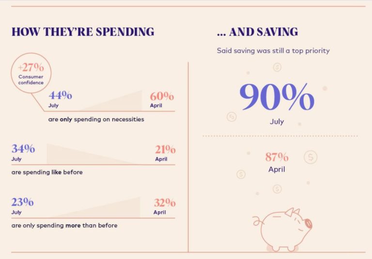 بشكل عام ، يعد إنفاق المستهلكين أحد أهم المجالات التي تتأثر بالفيروس. في استطلاع أجري في يوليو 2020 على أكثر من 19000 مستخدم من خلال منصة استرداد النقود Dosh ، أشار 90٪ من المستهلكين المذهلين إلى أن توفير الأموال كان أولوية قصوى ، ارتفاعًا من 87٪ في أبريل.