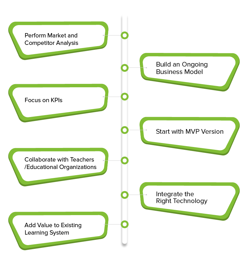 في مثل هذه الحالة ، فإن أفضل طريقة للاستمتاع بمزايا أعلى وتقليل الخسائر هي الاستثمار في مفهوم الحد الأدنى من المنتج القابل للتطبيق (MVP) . وهذا يعني ، تقديم أقل الميزات والتقنيات الوظيفية في تطبيق الهاتف المحمول الخاص بتكنولوجيا التعليم بحيث تساعد في دخول السوق في أقرب وقت ممكن ، وتوفير وقت التطوير والتكلفة ، والتحقق من صحة فكرة MVP الخاصة بك ، وما إلى ذلك.