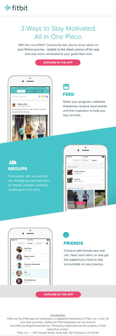 يُعد البريد الإلكتروني الخاص بتحديث المنتج من FitBit أدناه مثالًا رائعًا على كيفية تحديث تطبيقهم ، والبريد الإلكتروني يشجع الأشخاص ببساطة على التحقق من الوظيفة ، وليس بالضرورة شراء منتج جديد. هذه عملية بيع ناعمة لطيفة تحدد احتمالات الشراء في المستقبل بدلاً من الشراء الفوري. يجب أن يفكر برنامج البريد الإلكتروني الخاص بك في المدى الطويل وليس دائمًا في الوقت الحالي.