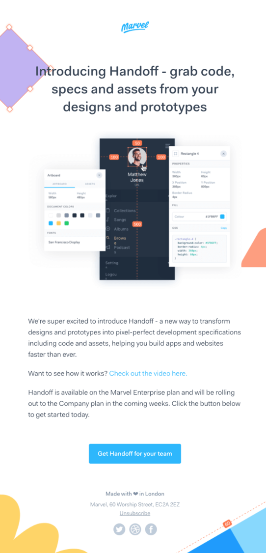 عندما أعلنت Marvel عن ميزة Handoff الجديدة ، أرسلوا مثال البريد الإلكتروني لتحديث المنتج أدناه. بدلاً من تضمين فقرات حول جميع الفوائد التي يوفرها Handoff للمستخدمين ، فإنهم يرتبطون بمقطع فيديو للميزة والصفحة نفسها حيث يمكن للأشخاص معرفة المزيد. هذا يمنع المحتوى الزائد من البريد الإلكتروني الذي يظهر على الصفحة ويحسن تجربة المستلم.