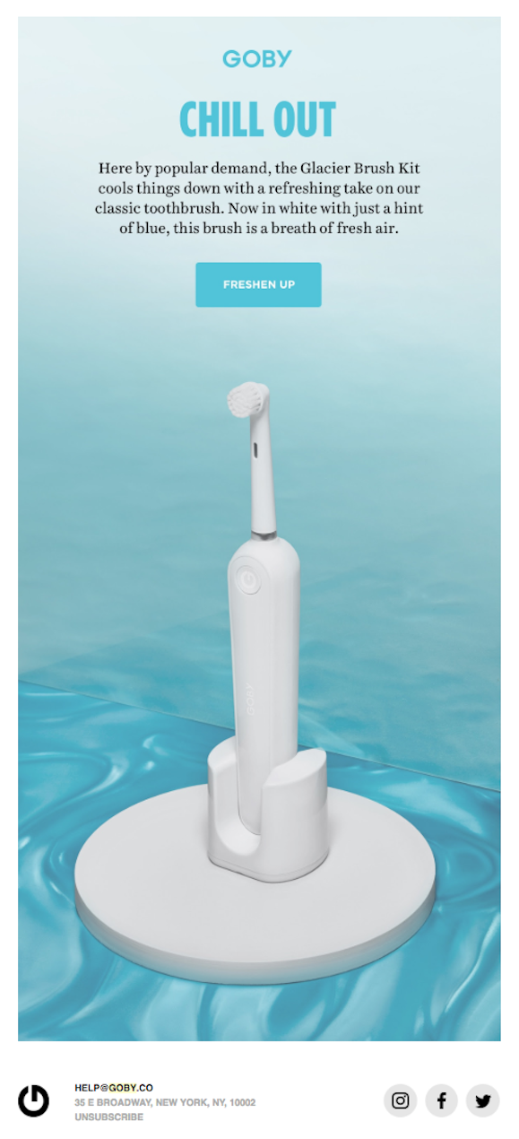 يوجد أدناه بريد إلكتروني رائع حقًا من Goby حول لون جديد لفرشاة الأسنان التي يطلقونها. يستفيد Goby من امتلاك منتج استهلاكي قد يخضع لعملية تجميل أو تحديث يرغب المستهلكون في معرفته في بريد إلكتروني تسويقي. قد ترسل شركات السلع الاستهلاكية الأخرى رسائل بريد إلكتروني لإعلان منتجات مماثلة إذا تم إصدار منتجاتها في إصدارات أو ألوان محدثة.