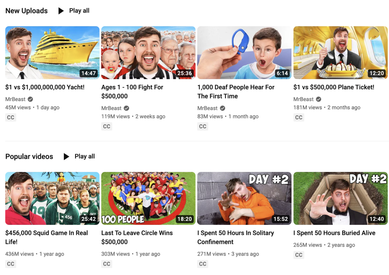 جزء مما يفصل قنوات YouTube المتوسطة عن القنوات عالية الأداء مثل Mr. Beast هو الجمع بين المحتوى الجذاب والإرشادات اللطيفة والمباشرة للتفاعل مع المحتوى: