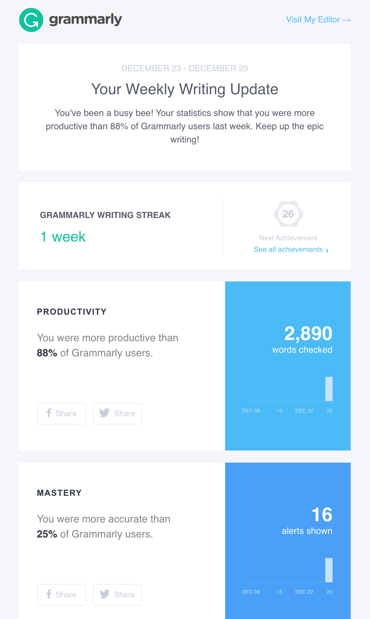 Der Kontext ist wichtig, um Upselling-E-Mails, die konvertieren, zu treffen, und Sie können Ihre E-Mail verwenden, um die Bühne zu bereiten. Im Beispiel von Grammarly unten wird dem Leser gezeigt, was er mit dem Unternehmen erreicht hat. Die Betreffzeile „Du warst letzte Woche episch produktiv!“ zusammen mit personalisierten Statistiken darüber, besser zu sein als andere Benutzer, geben Sie den Lesern einen selbstbewussten Schub.