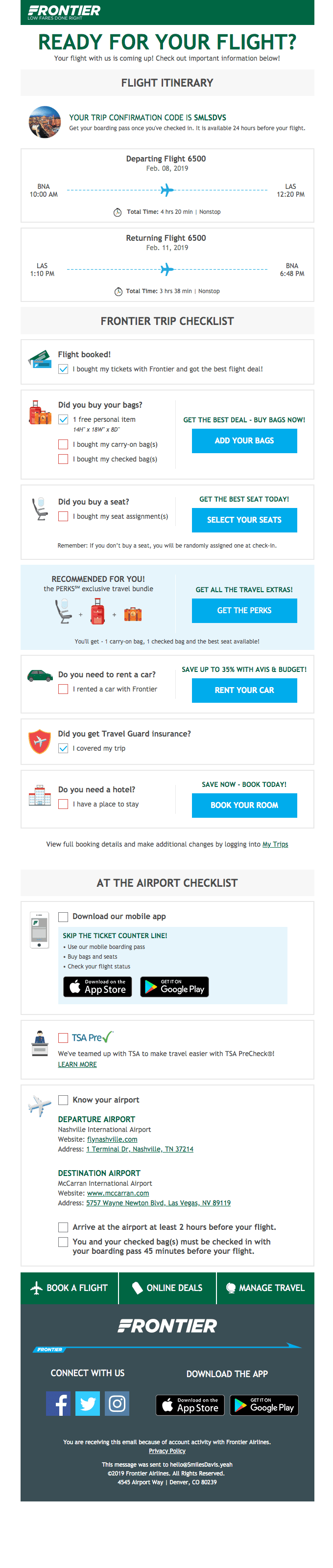 Clever ist jedoch, dass diese Ergänzungen als Checkliste positioniert sind. Während die meisten Checklistenpunkte dem Endergebnis von Frontier zugutekommen, ist sie dennoch nützlich für Passagiere, die sich organisiert und vorbereitet fühlen möchten. Frontier hat eine Upselling-E-Mail in sinnvollen Inhalt umgewandelt.