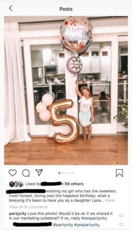 Sehen Sie, was Leute auf Facebook oder Instagram posten und nutzen Sie diese zu Ihrem Vorteil. Diese Bilder sehen noch natürlicher aus und können die Arbeit Ihres Teams bei der Erstellung Ihrer eigenen Bilder sogar reduzieren. Unten ist ein perfektes Beispiel! Jemand, den ich auf die High School ging, habe einfach Bilder von der Geburtstagsfeier ihrer Tochter gepostet und, wie Sie sehen können, hat Party City um Erlaubnis gebeten, dieses Foto für Marketingzwecke zu verwenden. So einfach ist das!