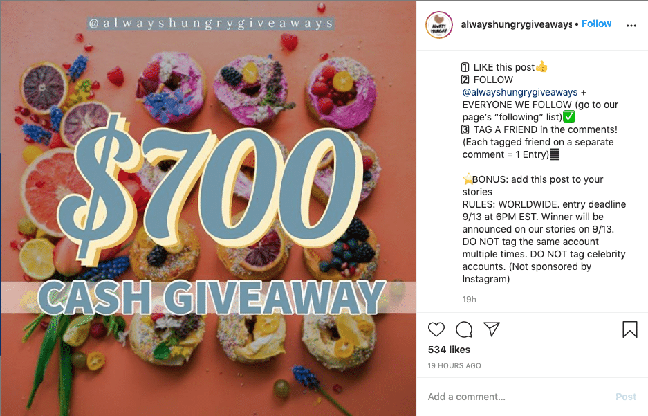 Veröffentlicht: 2020-09-24Ziehen Sie Ihr Telefon heraus und scrollen Sie schnell durch Ihren Instagram-Feed. Sie werden wahrscheinlich mindestens einen Beitrag sehen, in dem ein Werbegeschenk angekündigt wird und Sie aufgefordert werden, einen Kommentar zu hinterlassen und möglicherweise einen Freund zu markieren. Der Grund, warum Sie höchstwahrscheinlich ein Giveaway in Ihrem Feed erwarten, ist, dass derzeit 33,5 Millionen Instagram-Posts mit #giveaway mit einem Hashtag versehen sind.