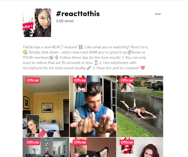Um Ihnen Anregungen zu geben, überprüfen Sie das #reacttothis-Tag, um zu sehen, wie Leute auf andere TikTok-Videos reagieren.