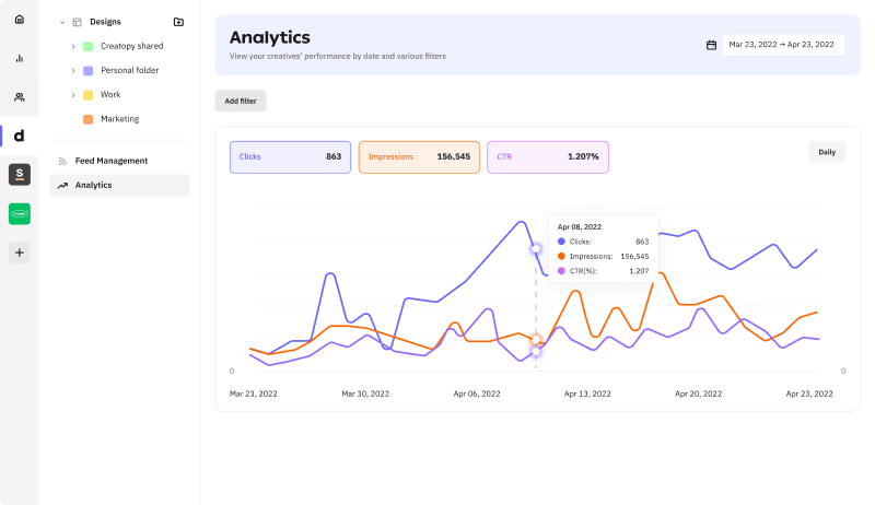 Das Erstellen und Optimieren von Display-Werbekampagnen erfordert viel Arbeit, aber der gesamte Prozess wird viel einfacher mit Tools, die Ihnen helfen, sich wiederholende Aufgaben zu eliminieren, die zu viel Zeit in Anspruch nehmen. Creatopy bietet kreative Automatisierung und endlose Möglichkeiten zur Anzeigenpersonalisierung sowie Anzeigenschaltung in zahlreichen Werbenetzwerken und Leistungsverfolgung. Es stärkt Werbetreibende, da es Unternehmen wie Sorted und Marketingagenturen wie Brandfinity geholfen hat, den Prozess der Anzeigenerstellung zu beschleunigen und die Markenkonsistenz über alle Assets hinweg aufrechtzuerhalten. Sie können A/B-Tests jetzt effizienter durchführen und ihre Anzeigenleistung verbessern, und Sie können das auch. Machen Sie einen Rundgang durch die Plattform und entdecken Sie alle ihre Funktionalitäten.