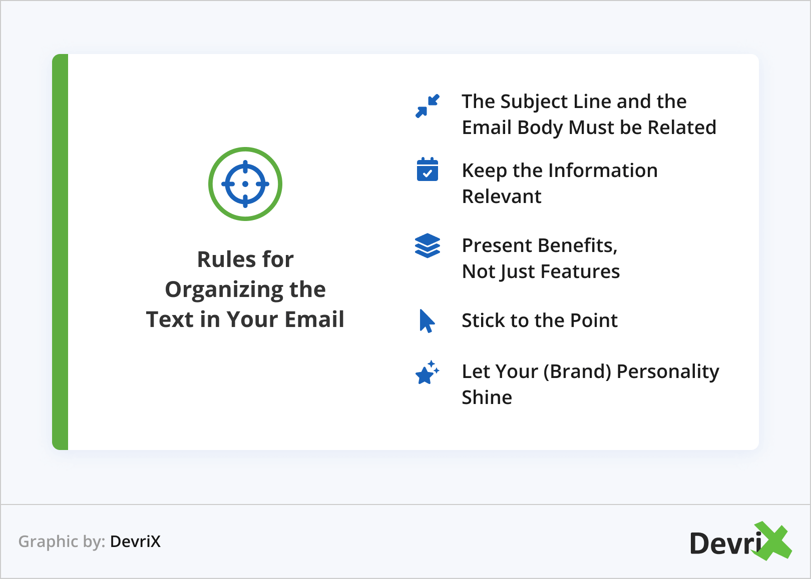 - Bleib bei der Sache. E-Mails sind nicht der Ort für langatmige Inhalte. Wenn Sie Ihr Publikum beschäftigen möchten, halten Sie den Text besser kurz und bündig.