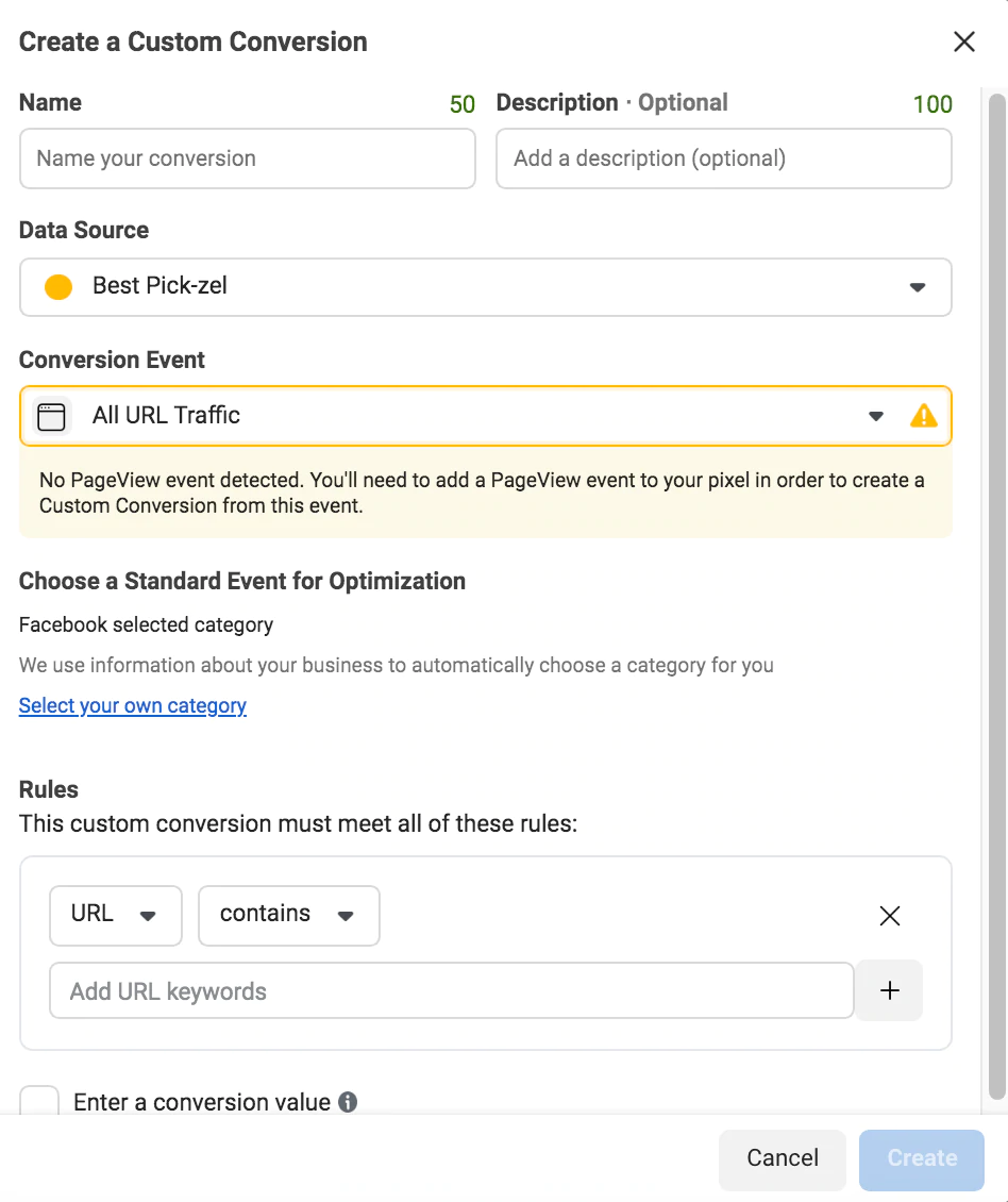 Sie können auch die Kategorie für die Konvertierung auswählen und einen Geldwert hinzufügen. Wenn Sie beispielsweise eine benutzerdefinierte Conversion erstellen, die Besucher einer E-Book-Downloadseite verfolgt, können Sie die Kosten des E-Books einbeziehen. Diese Funktion hilft Ihnen herauszufinden, ob Ihre Werbekampagnen profitabel sind. Wenn Sie 20 US-Dollar für Ihr E-Book berechnen, aber 25 US-Dollar für jeden Kauf ausgeben, der über Facebook-Werbung erfolgt, möchten Sie wahrscheinlich einige Änderungen an dieser Kampagne vornehmen.