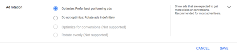 Vor dieser Änderung unterstützte AdWords vier Optionen für die Anzeigenrotation: Optimierung für Klicks, Optimierung für Conversions, gleichmäßige Rotation und unbegrenzte Rotation. Während viele Account Manager an einem traditionellen A/B-Anzeigentestsystem mit unbegrenzter Rotation festgehalten haben, haben wir in letzter Zeit erheblichen Druck von unseren Vertriebsmitarbeitern gespürt, unsere Einstellungen für die PPC-Anzeigenrotation zu bewerten. Seit Monaten fördern sie die Einführung einer automatisierten Anzeigenrotation, was dieses Update weniger überraschend macht. Ab Ende September werden diese Rotationseinstellungen für digitale Vermarkter auf Anzeigengruppenebene verfügbar sein.