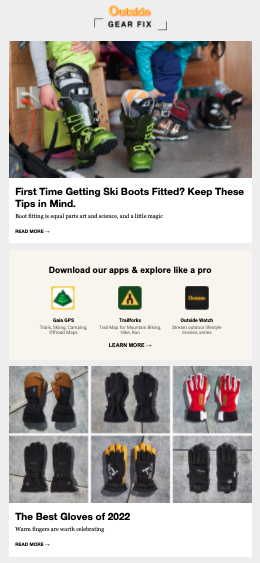 Outside Online weiß, dass die Abonnenten des Gear Fix-Newsletters vor allem hier sind, um Ausrüstungsbewertungen von Experten zu erhalten. Aus diesem Grund enthält der Newsletter keine Affiliate-Links im E-Mail-Text, sondern lockt die Leser mit frischen Inhalten. Sobald sich die Empfänger zu diesen Artikeln durchklicken, finden sie Affiliate-Links zu den erwähnten Produkten.