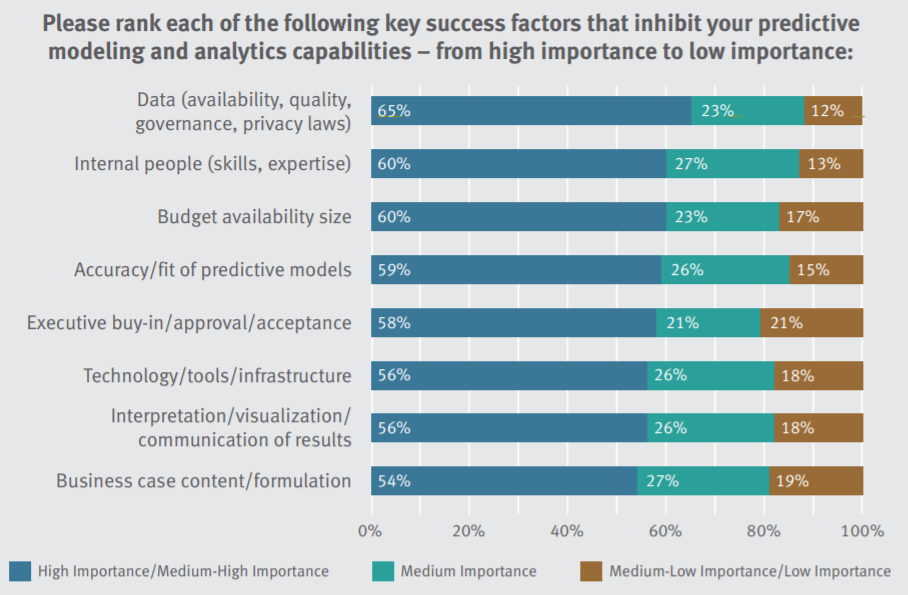 In einer aktuellen Umfrage von Protoviti unter leitenden Angestellten wurden Daten als der größte Hemmschuh für die weit verbreitete Einführung von Predictive Analytics in Unternehmen eingestuft. Qualität war einer der wichtigsten Modifikatoren, um einem so nebulösen Begriff wie „Daten“ Spezifität zu verleihen.