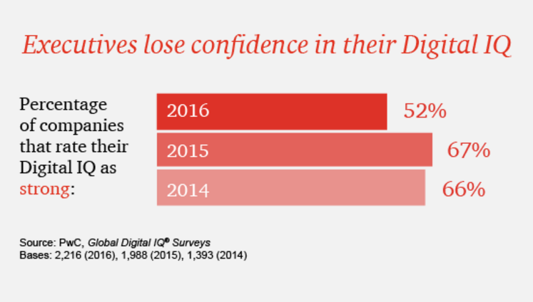 Dies kommt zu einer Zeit, in der das Vertrauen der Führungskräfte in die digitale Expertise ihres Unternehmens zu sinken scheint. Die jüngste Digital IQ-Umfrage von PwC zeigt ein sinkendes Vertrauen der Führungskräfte in die Fähigkeiten ihres Teams: